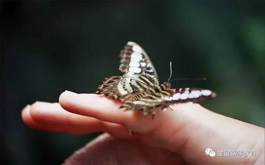 可以想象,当我们想捉一只停在树枝上的蝴蝶时,你的动作一定很轻,不能让蝴蝶惊飞了。这时你可以体会手指、手腕和小臂都处于控制状态,你将会用很大的力量控制着并暗暗地将手移动到蝴蝶旁,出其不意地将蝴蝶抓住。这时你可以感觉到抓蝴蝶的三个手指及手的其他部位,都用了很大的力量,尤其是大拇指、二指和三指这三个指尖,是用了控制的力量,做出一个紧张而且突然的动作。这种用力的过程,始终是轻轻的。这种体会,可以启发学生理解弹“弱”的声音,并非不用力。另外还可以叫学生用脚尖走路,为了不吵醒别人,需要轻轻抬起来,轻轻放下这样控制的用力,脚尖的承受力是很大的。因此,对于弹奏“弱”的声音,一定视其乐曲的性质,调整好控制的力量和触键的速度,才能弹出满意的效果。
